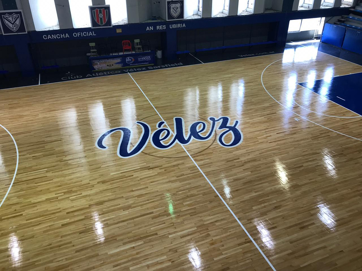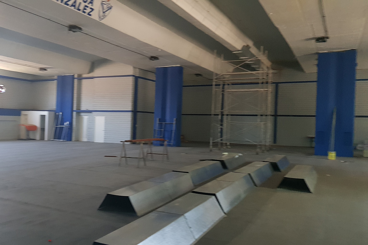 Obra de remodelación: pulido y pintado de la superficie, nueva iluminación led (700lux, apto transmisión 4k), nuevas gradas telescópicas, muro divisorio, protecciones en columnas y pintura general.